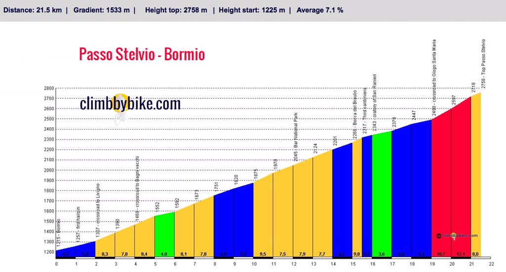 From Bormio (at 1,225m) to the pass it’s a 21 km of climbing and an ascent of 1,533m. Then it’s a 111km and 2,496m descent to Bolzano (262m). How cool.