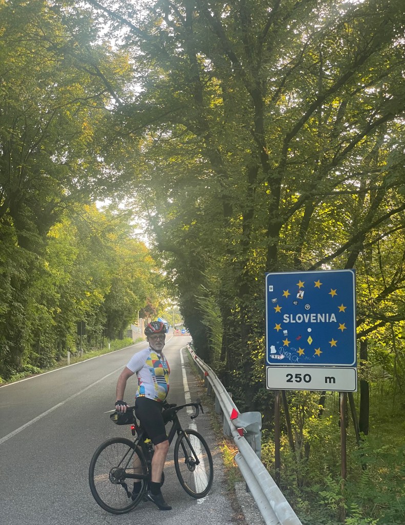 We head north-east over the border between Italy and Slovenia. To get there you have climb over 400m in elevation. My Garmin (computer) indicates an average 7% climb not dissimilar to the hills at home. I feel somewhat deceived when I realise that the first half of the climb is 1-2% in gradient, while the remainder is 15-17%! It’s a little after 6am and we’re cooked!
