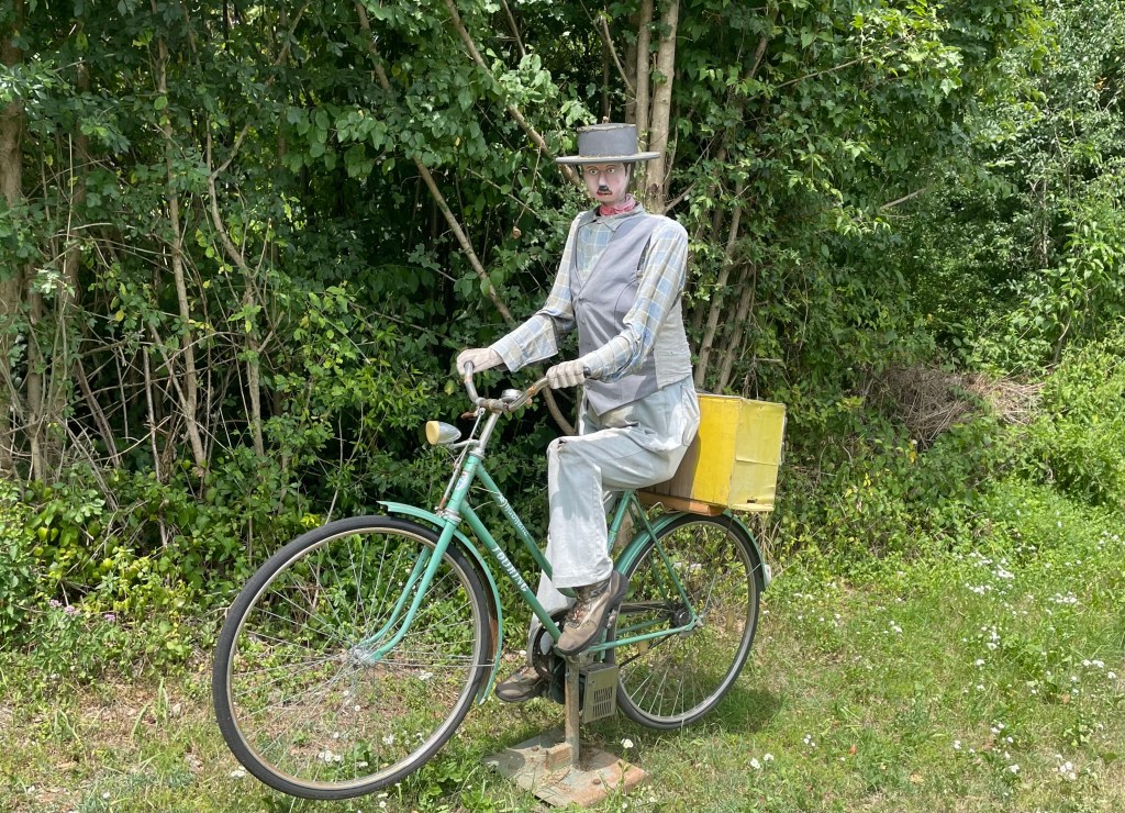 Along the way we meet a wooden cyclist stationary yet pedalling towards us (look closely in the photo you’ll see a motor under the centre bracket).
