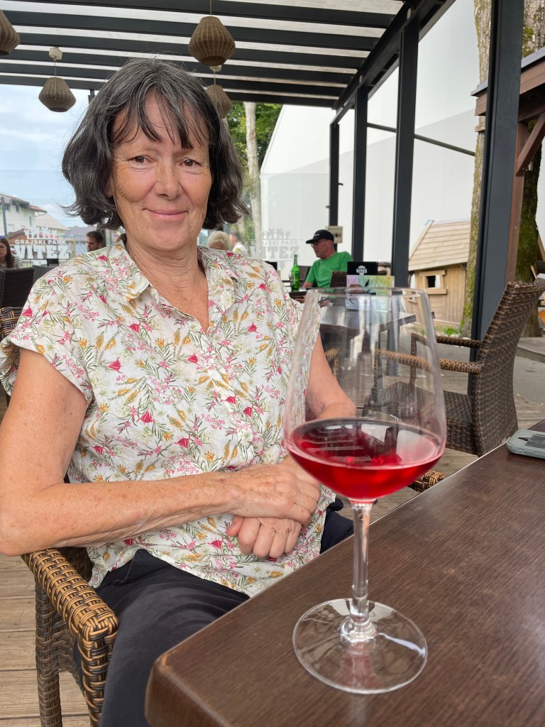 Sue and I go for a stroll and come across a bar where Sue is able to demonstrate her oenological talents with a glass of dry red Cviček wine.