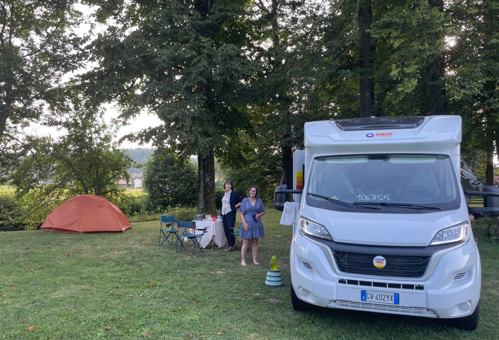 Sue and Liz have set up a rather nice camp beside a small stream in a quiet field under a stand of grand leafy trees – the perfect place to finish the day.