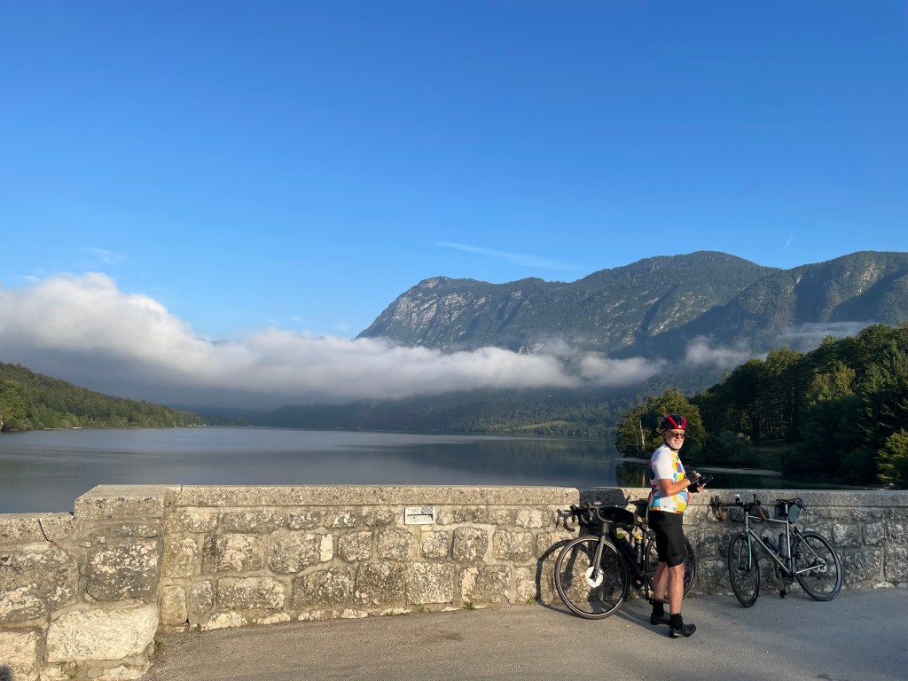 Sam and I set out early as usual in cool, moist conditions after another spectacular evening storm. Our first stop is Lake Bohinj, a beautiful lake just inside the park border on its south-eastern side. The sky is clear except for a single cloud that hovers over the lake. A bit too early for a dip, Sue and Liz go for a delicious swim here later on.