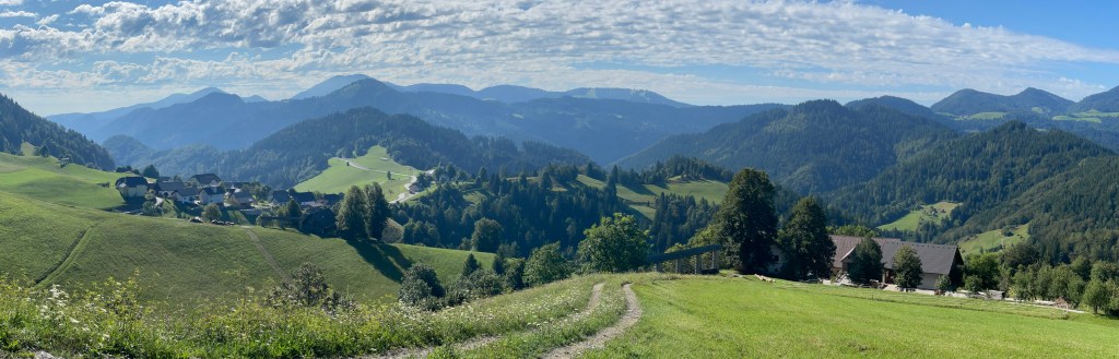 On our descent though we’re treated to a beautiful vista of rolling hills and mountains that in winter would make ideal cross-country skiing terrain.