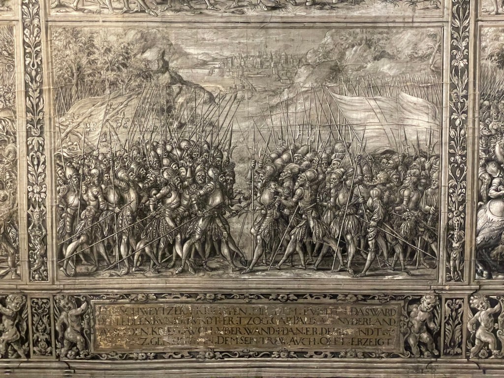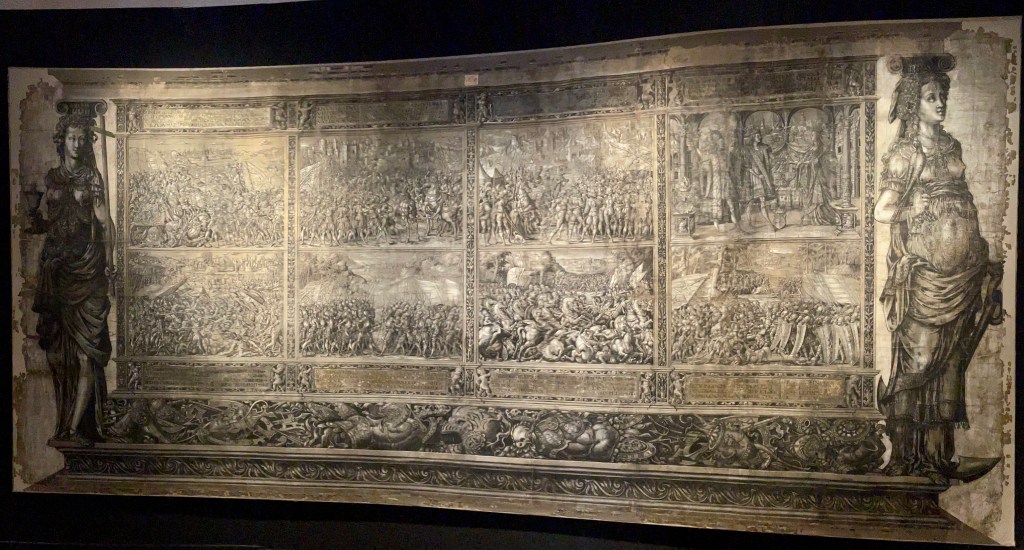 And this full-sized paper draft design for an ornate black marble cenotaph of Emperor Maximilian I created by Florian Abel, an artist from Prague.