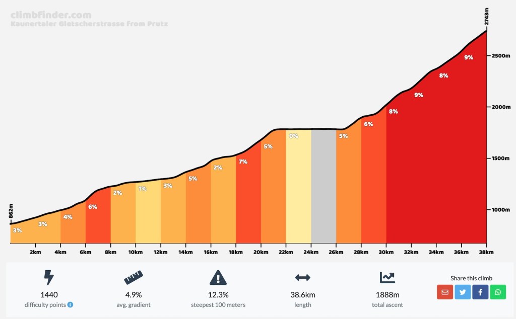 The climb by bike is in a series of steps for the first 30km, then rises from just below the tree-line at a steady 10-12% incline for the remaining 8km.