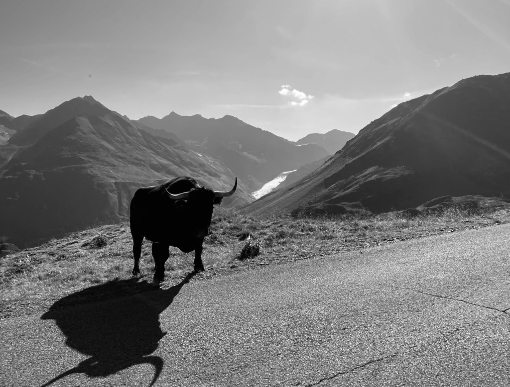 Above the tree-line I encountered a few cute marmots and lots of cattle, including this bull who decided the moment to cross the road to get to a freshly laid salt lick, was precisely the time I arrived on my bike! The bull, of course, had right of way.
