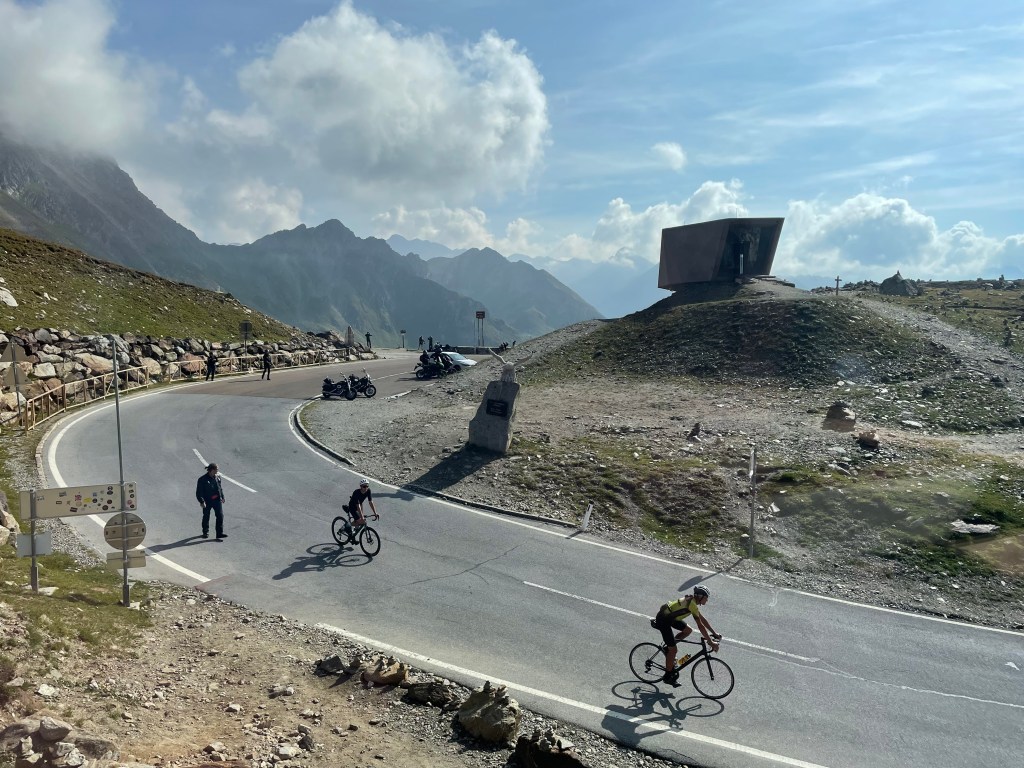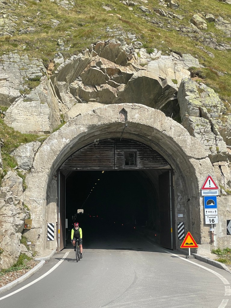 The descent into Italy was a wild affair of tunnels and switchbacks whilst negotiating the steep narrow road with camper vans, buses, motorbikes and lots of cyclists snaking their way up to the pass.