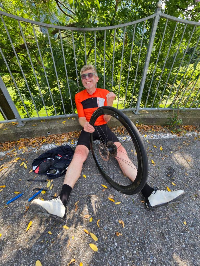 Just before lunch at Merano, I got another puncture! This new hi-tech equipment is great – only 40 minutes to change the tube!