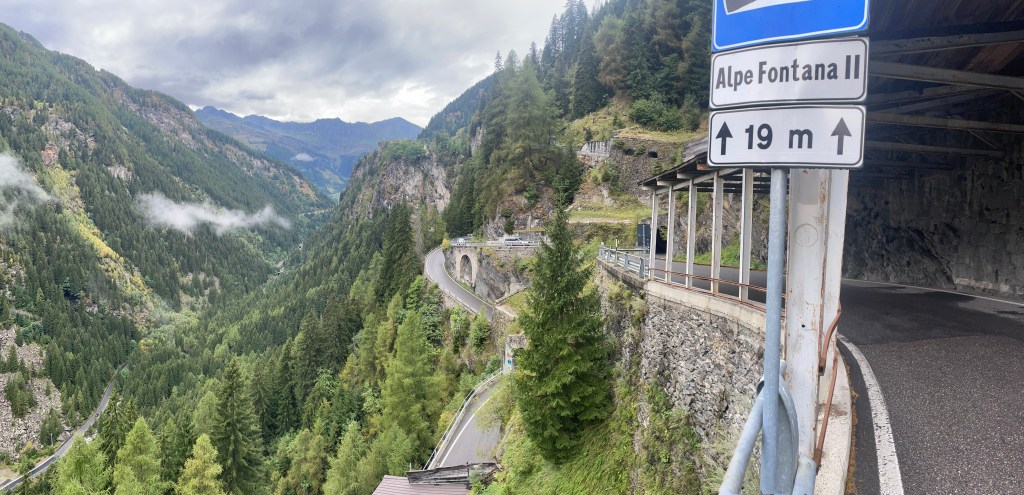 The ride to Majola Pass and into Italy was hardly noticeable from the Swiss side. It soon plunged steeply into the Val Bregaglia and nearly 1500m to the town of Chiavenna below.