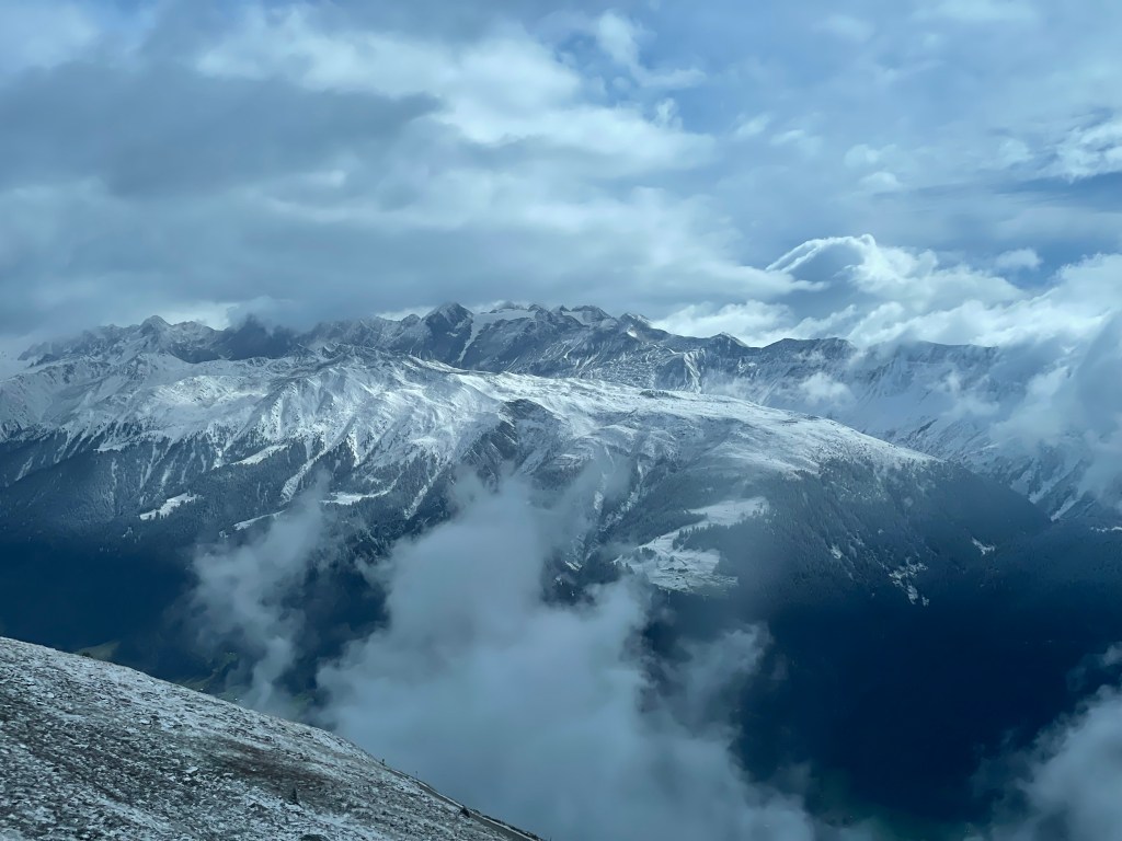 The rain has ceased. The clouds are lifting. Fresh snow on the peaks.