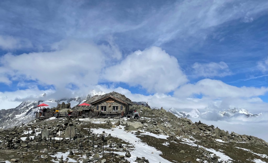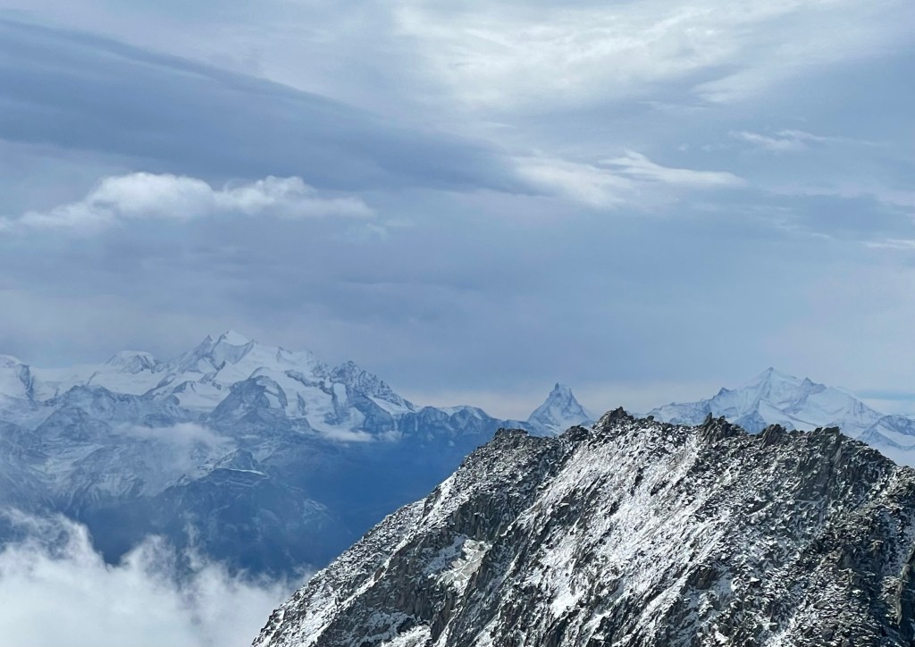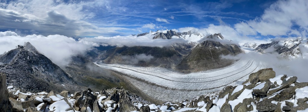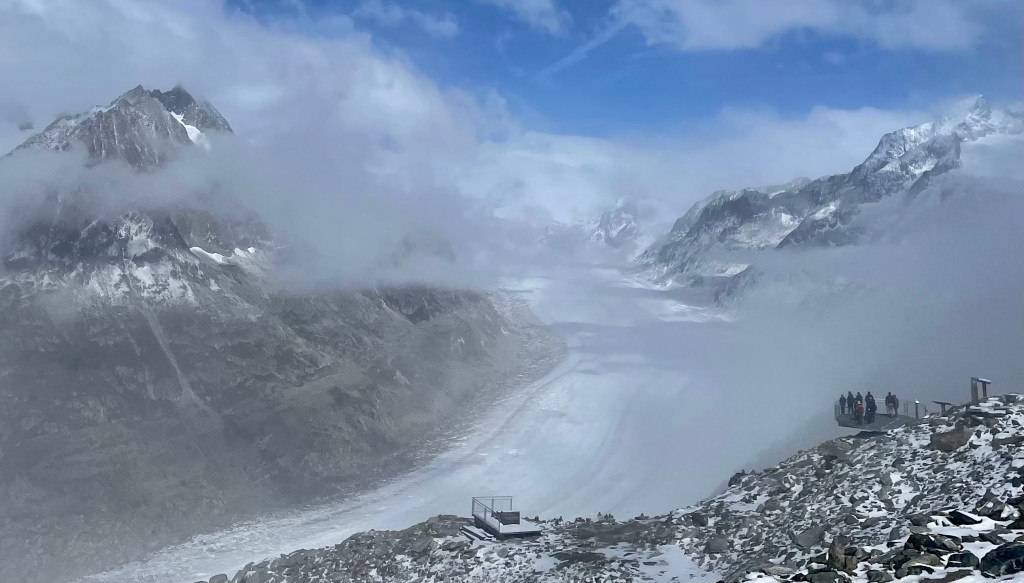 I make the short climb to Eggishorn, at 2,927m for a 360° panorama. It’s a little crowded and noisy, so I move out to the edge where for the next hour or so I sit in silence and stillness taking in the immensity of the slowly shifting landscape while clouds swirl about me. It was so beautiful, I pondered sitting there for ever…