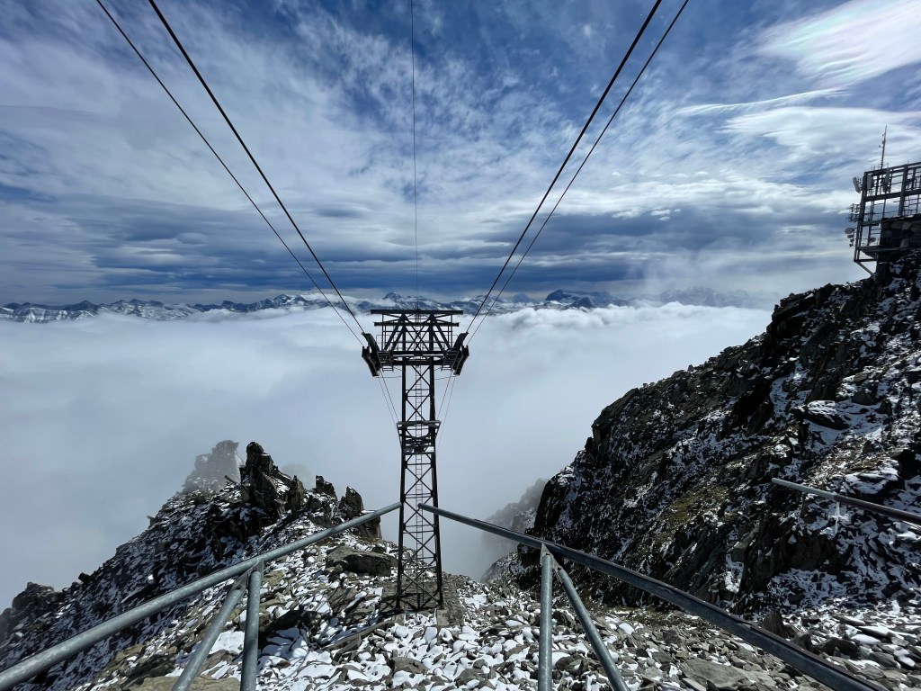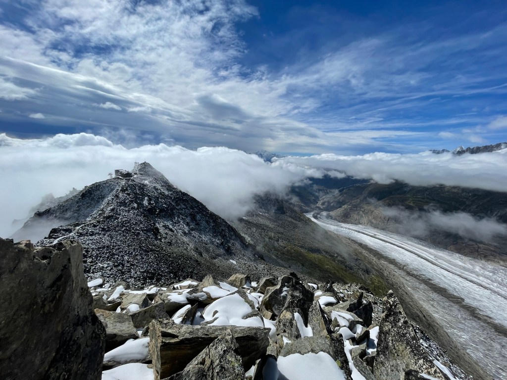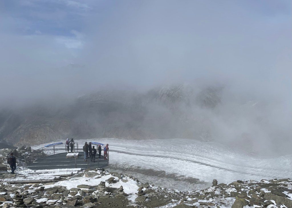In the thin air at the top station, a parting of the clouds reveals glimpses of the massive flow of ice and the surrounding peaks where snow has accumulated and compacted over thousands of years.