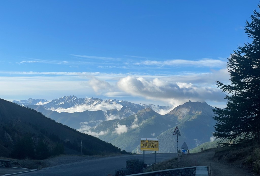 All thoughts of a problem with the route disappeared on a beautiful ascent of the Col d’Izoard, winding our way up through cloud and conifer forest that reached right up to the pass. The clouds that had been swirling about me lifted just as I arrived, revealing spectacular alpine scree slopes up close and rugged mountain peaks far away to the south. It felt like another magical day in the Alps unfolding.