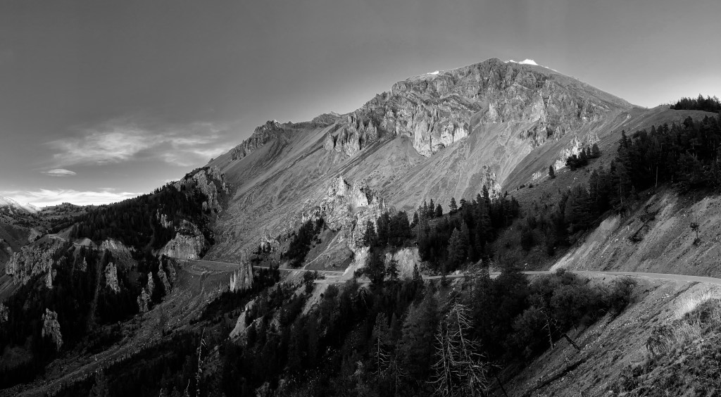 Arriving at the top before Sue and Liz, wanting to avoid waiting in the cold, the lack of traffic, and remembering what a beautiful road it was on the way up, I took the rapid descent and pick up in Briançon option.